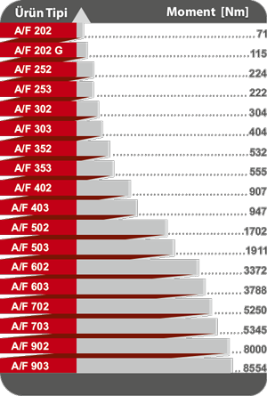 A/F Serisi Redüktörler 10 gövde büyüklüğünde ayak bağlantılı ve flanş bağlantılı olarak imal edilmektedir. Gövde malzemesi sfero olup dişliler 8620 dövme çelikten imal edilerek maksimum momentlerde zarar görmesi engellenmiştir.